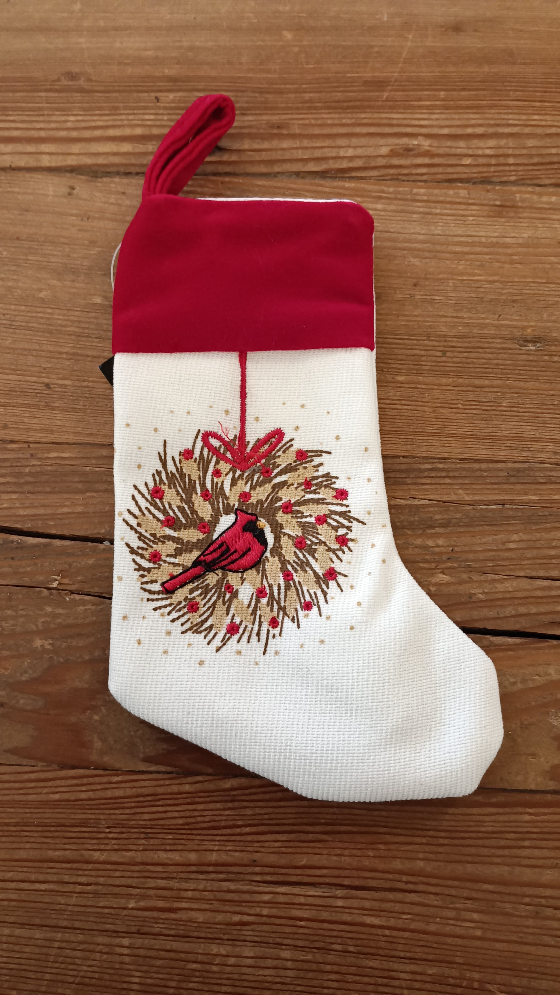 6 inch miniature stocking features festive embroidered red cardinal and wreath.